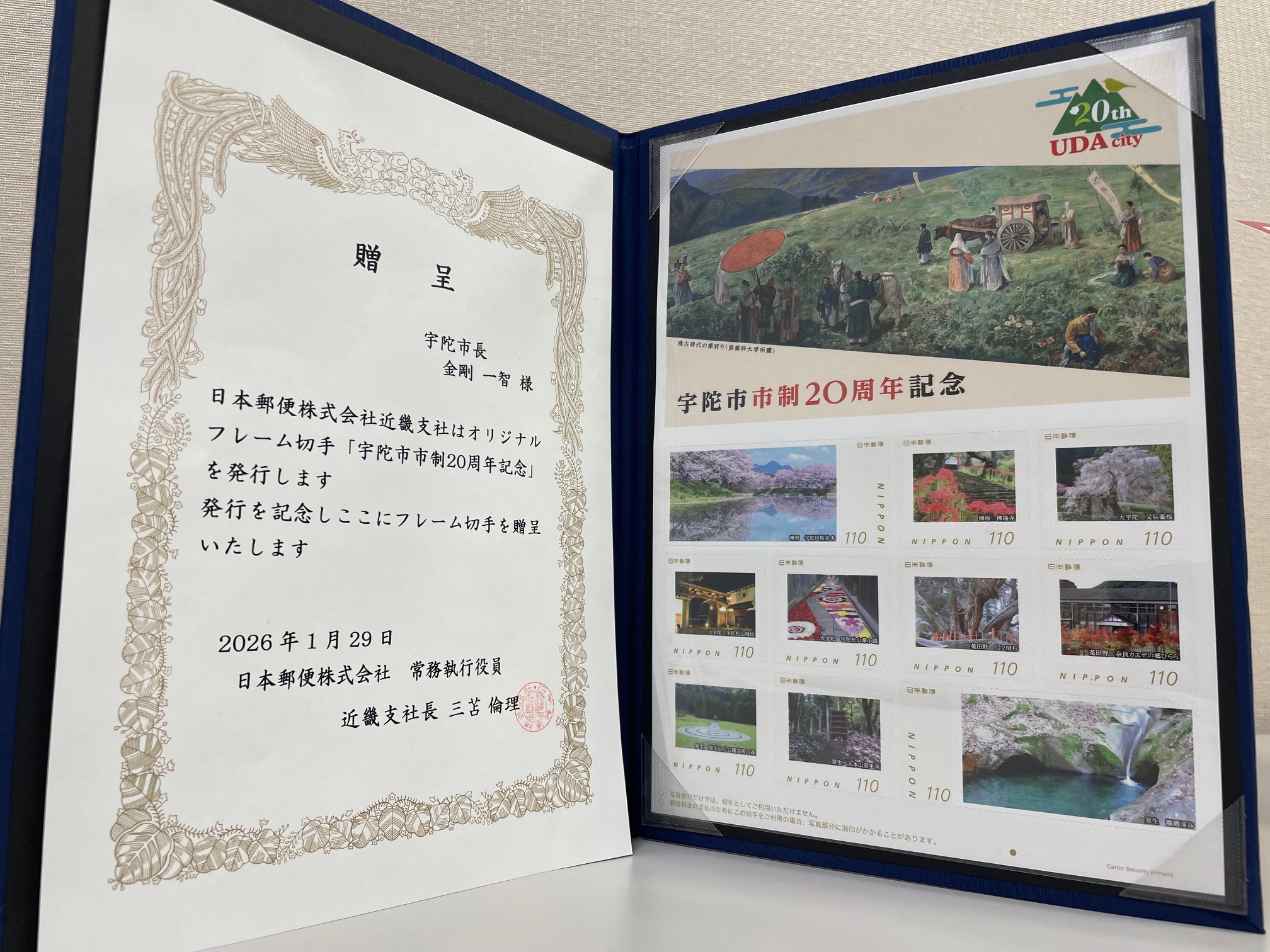 110円切手10枚のシートには、宇陀川桜並木や佛隆寺、室生山上公園芸術の森など、宇陀市の文化と魅力が満載。金剛市長は「歴史から現代まで宇陀市に行きたいと思わせる図柄」と喜びを伝えた。中村統括局長は「フレーム切手を通じて宇陀市の魅力発信に貢献したい」と決意を示した。